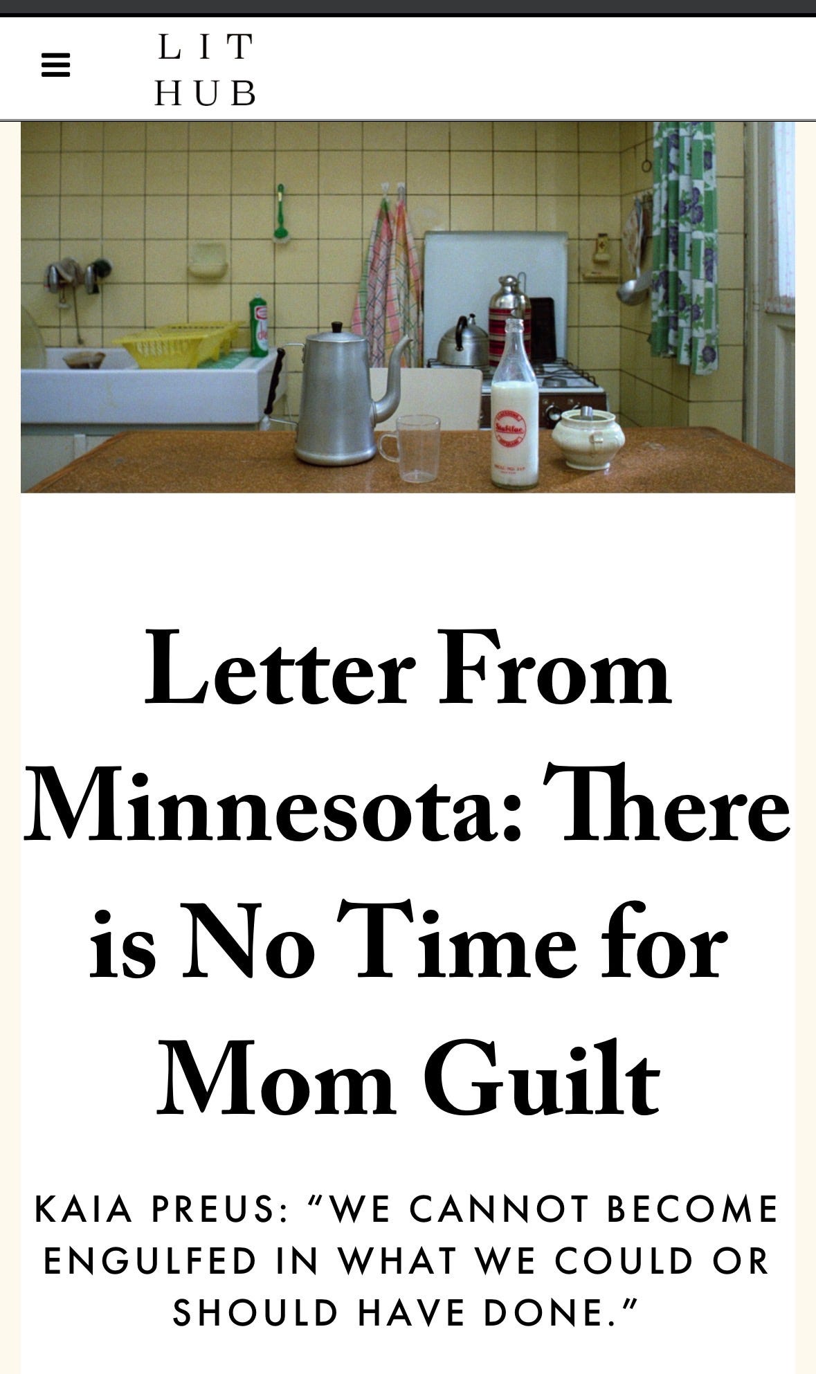 My piece “There is No Time for Mom Guilt” was published in Literary Hub this month. I’ve been a Lit Hub super fan for many years, and I was so excited to appear in their Letter From Minnesota series alongside forty-three other Minnesota writers and in such a moment. The response to my essay has been really wonderful, and I am so appreciative of everyone who has read my piece and shared their thoughts with me.